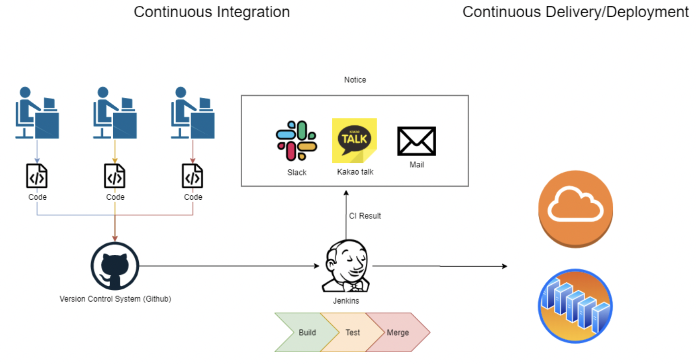 Why ? 작은 단위로 빈번하게 merge하기에 문제 발생 범위가 작기 때문이다(빈번하게 merge해도 빌드, 테스트가 자동이라 간편) 결과적으로 코드의 품질이 올라간다.✏️ CD는 지속적 제공/배포라는 의미이다. CI를 통해서 빌드, 테스트가 완료되어 배포될 준비가 끝난 애플리케이션을 개발자가 수동으로, 혹은 자동으로 배포를 진행하는 것.