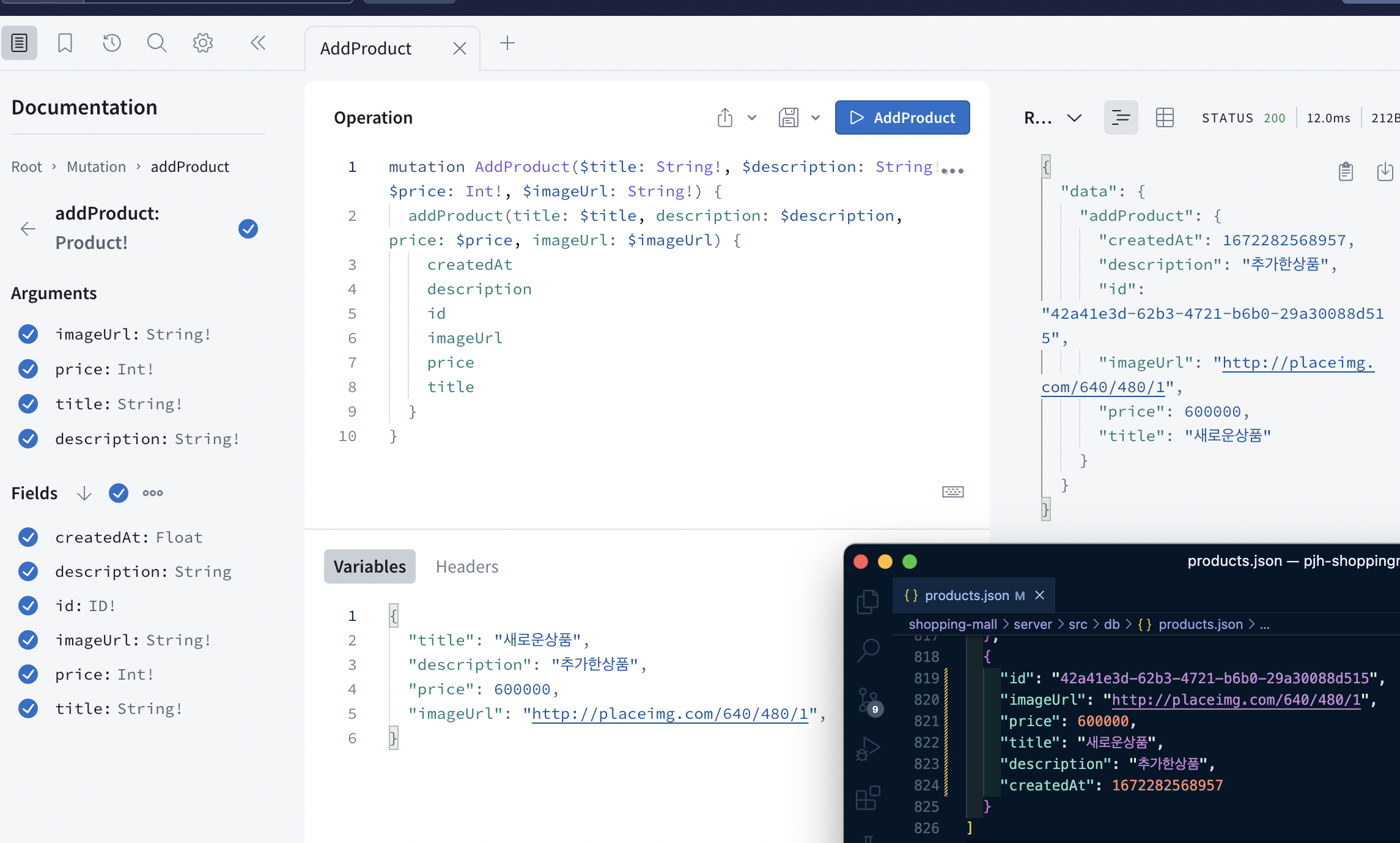 // src/graphql/product.ts export const ADD_PRODUCT = gql` mutation ADD_PRODUCT( $imageUrl: String! $price: Int! $title: String! $description: String! ) { addProduct( imageUrl: $imageUrl price: $price title: $title description: $description ) { id imageUrl price title description createdAt } } `;