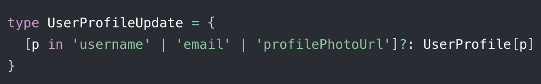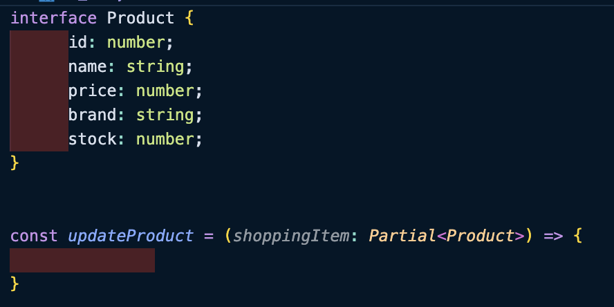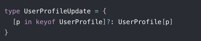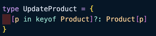 물론 in과 keyof 을 통해서 Product의 속성들을 UpdateProduct의 optional 속성으로 가져오는 식으로도 구현이 가능하다.