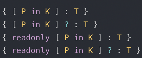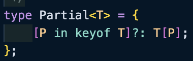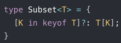 ✅ 위 코드는 키와 값이 있는 객체를 정의하는 타입을 받아 그 객체의 부분 집합을 만족하는 타입으로 변환해주는 문법이다.