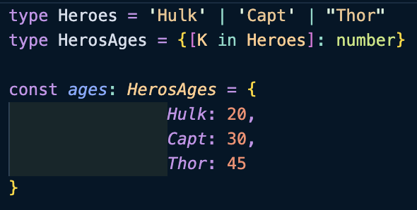 앞에서 정의한 Heroes 타입의 3개의 문자열을 각각 순회하여 number 타입을 값으로 가지는 객체의 키로 정의된다.