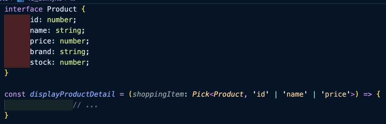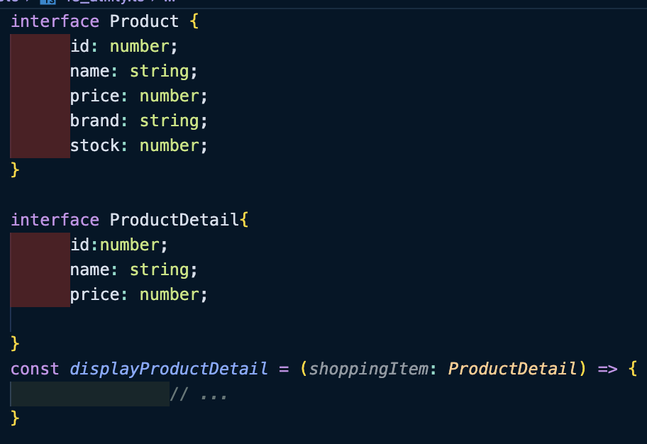 id, name, price, brand, stock 속성이 사용id, name, price 속성만 사용Product에 대한 속성들은 interface에 담겨있다. 이때 상세페에지에서 동작하는 displayProductDetail의 인자로 id,name,price를 주기 위해 별도의 interface를 생성하였다.
