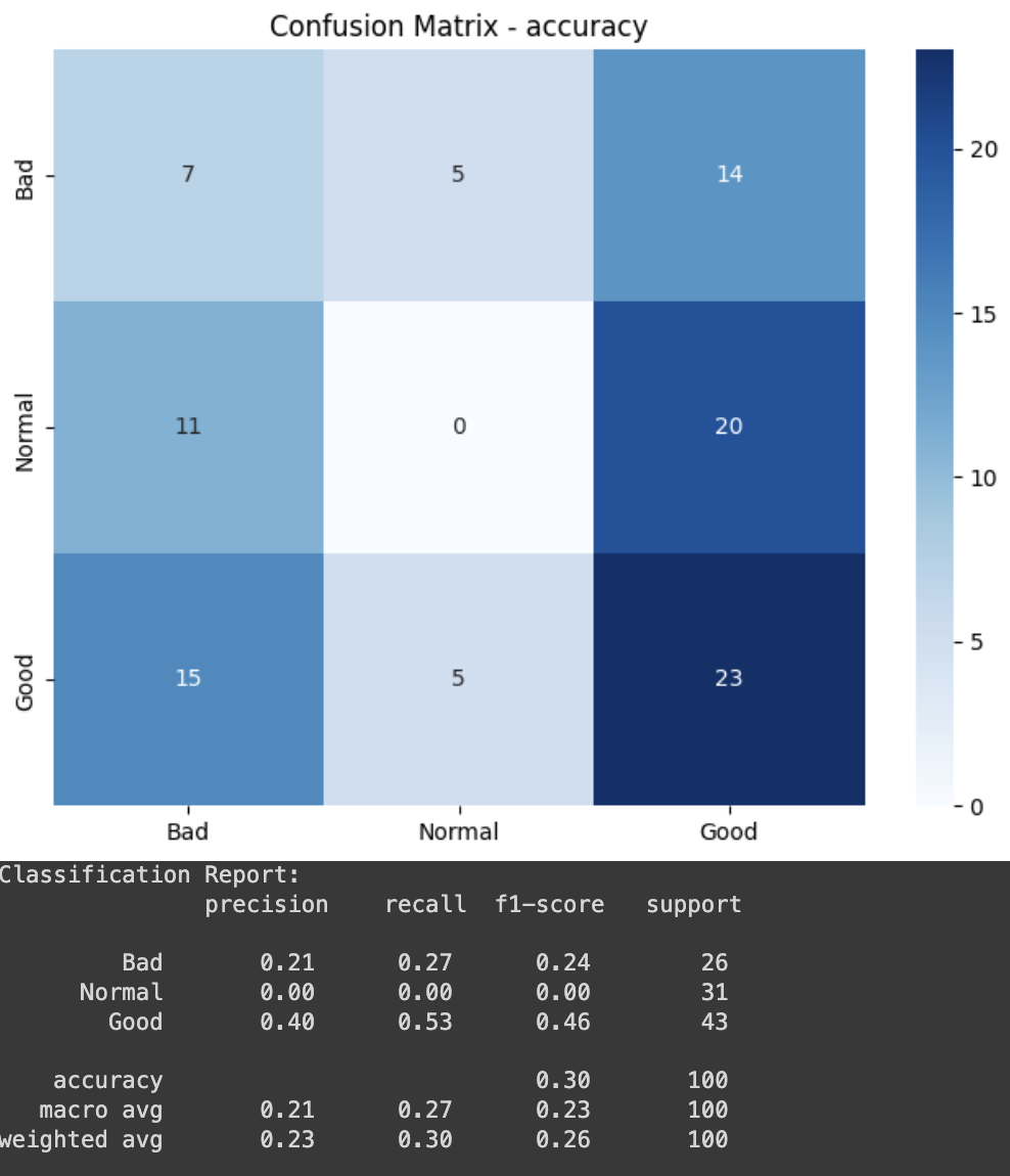 In this step, we evaluate classification performance of our models. We first initialize target_names as a list of classes (Bad, Normal, Good), and y_test and y_pred are assigned the actual and predicted values for the ‘accuracy’ score. Next, we generate the confusion matrix. The confusion matrix is computed using scikit-learn’s confusion_matrix() method, comparing the actual(y_test) and predicted(y_pred) values. Then we visualize the confusion matrix. We create a heatmap for the confusion matrix, and the graph is displayed with class labels along the axes. Finally, we print the classification report. It includes precision, recall, f1-score and support for each class. If you execute the code, you will have a result looks similar to the image below.