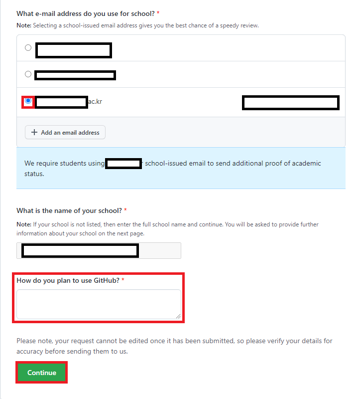 Add email address 에 본인의 학교 이메일을 등록한다.