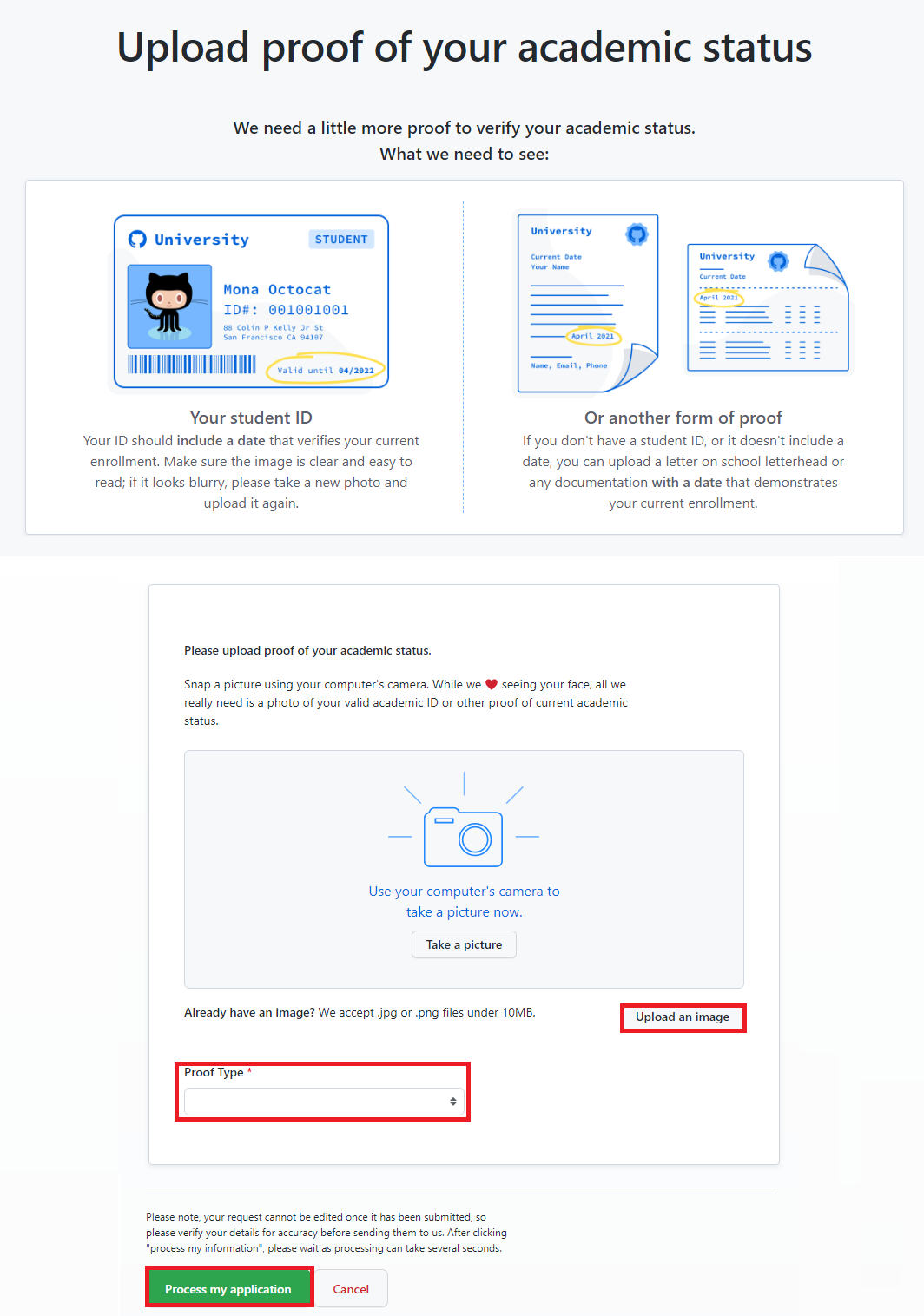 학교에서 발급한 확인 가능한 이메일 주소를 가지거나 현재 학생 상태를 증명하는 문서를 업로드해야한다.