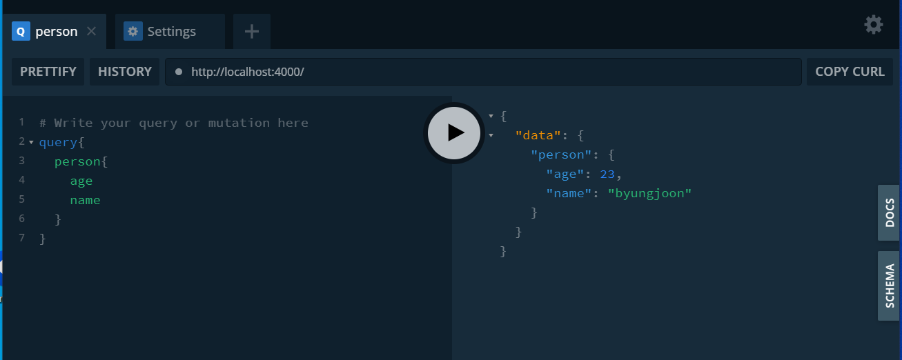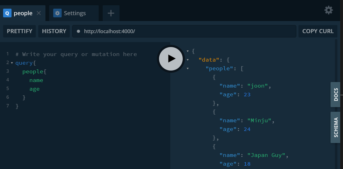 에서 GraphQL-yoga안에 있는 playGround를 통해 Query가 받아오는 값을 볼 수 있다.
