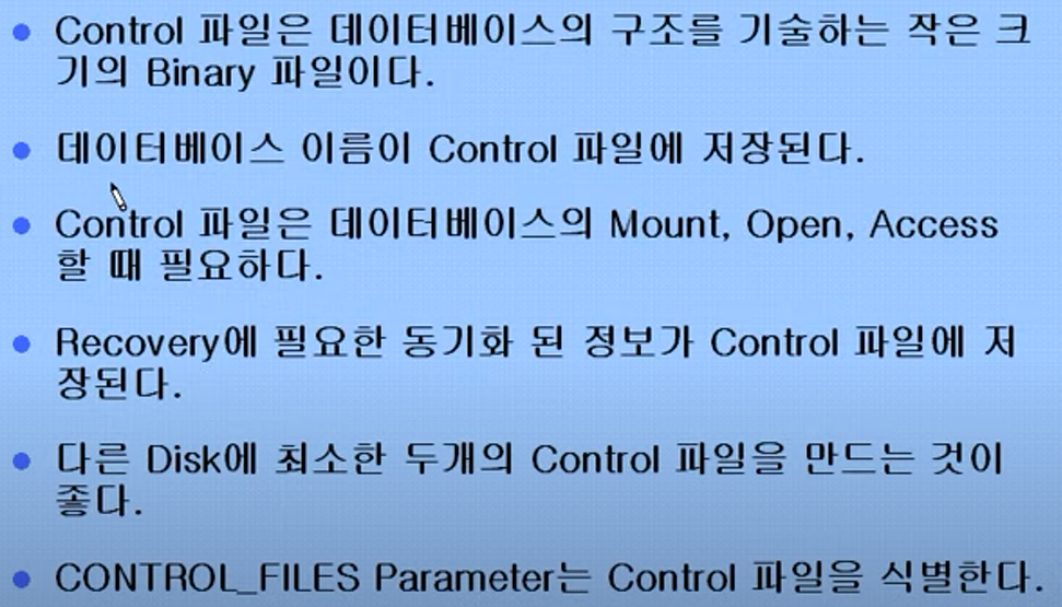 Control file : 데이터베이스의 구조를 기술하는 작은 크기의 binary 파일이다.