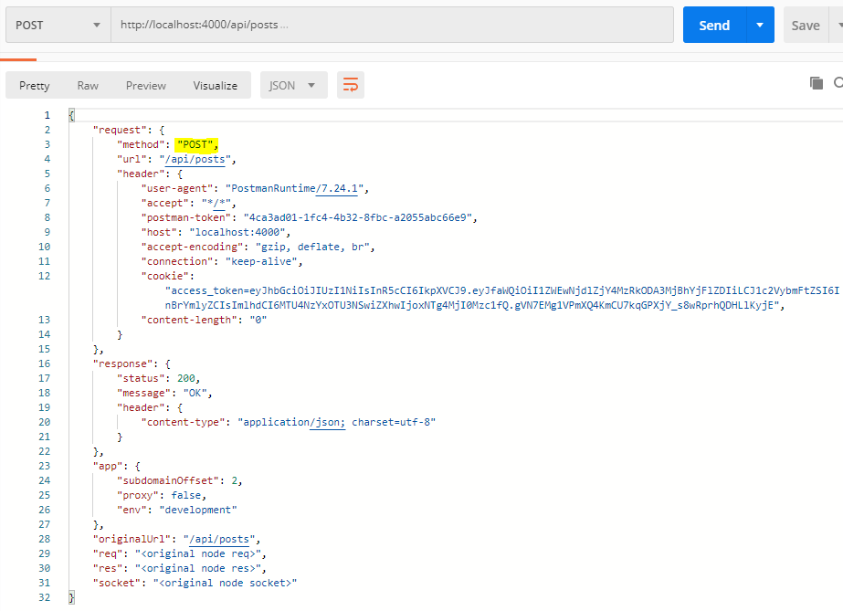 {"request":{"method":"GET","url":"/api/posts","header":{"host":"localhost:4000","connection":"keep-alive","cache-control":"max-age=0","upgrade-insecure-requests":"1","user-agent":"Mozilla/5.0 (Windows NT 10.0; Win64; x64) AppleWebKit/537.36 (KHTML, like Gecko) Chrome/81.0.4044.122 Safari/537.36","accept":"text/html,application/xhtml+xml,application/xml;q=0.9,image/webp,image/apng,*/*;q=0.8,application/signed-exchange;v=b3;q=0.9","sec-fetch-site":"none","sec-fetch-mode":"navigate","sec-fetch-user":"?1","sec-fetch-dest":"document","accept-encoding":"gzip, deflate, br","accept-language":"ko-KR,ko;q=0.9,en-US;q=0.8,en;q=0.7","cookie":"access_token="}},"response":{"status":200,"message":"OK","header":{"content-type":"application/json; charset=utf-8"}},"app":{"subdomainOffset":2,"proxy":false,"env":"development"},"originalUrl":"/api/posts","req":"<original node req>","res":"<original node res>","socket":"<original node socket>"}