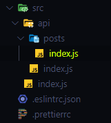 src/api처럼 localhost:4000/api/이부분 2단계를 처리하려면 위처럼 api안에 또다른 폴더(여기선 posts)를 만들어주고, src/api/index.js에서 처리해주면 된다.