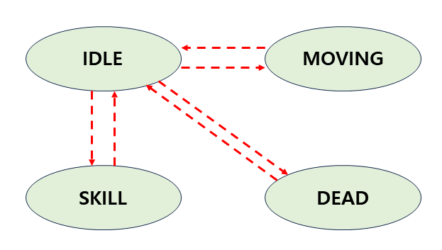 몬스터의 상태수가 적다면 몬스터의 행동은 하나의 유한상태머신(FSM)으로 나타낼 수 있다. 각 상태에서 취할 수 있는 행동이 서로 다르고 바뀔수 있는 상태로 전이하는 것을 그래프로 나타래 수 있다.