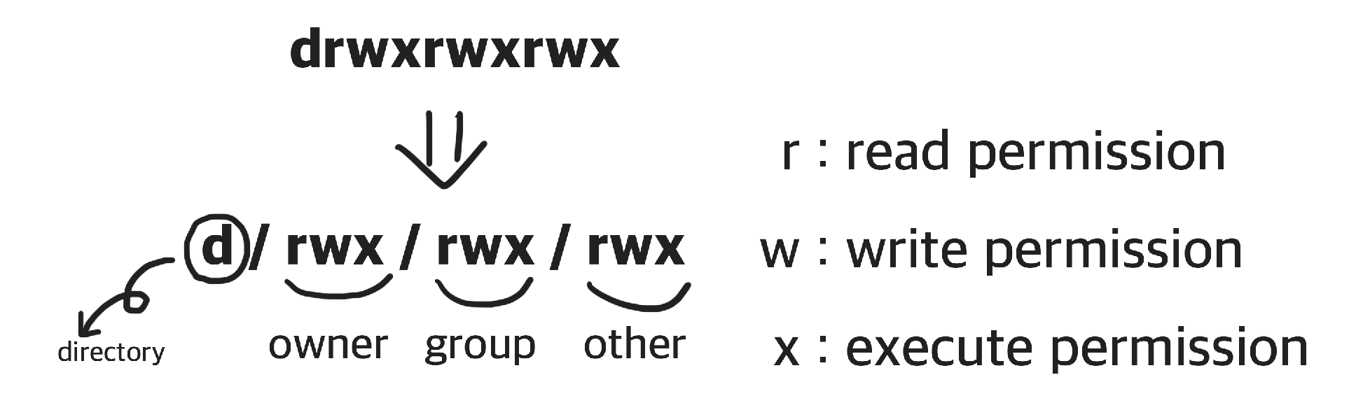 r μ read permission μΌλ‘ μ½κΈ° κΆν, wλ write permssionμΌλ‘ μ°κΈ° κΆν, κ·Έλ¦¬κ³ xλ execute permissionμΌλ‘ μ€ν κΆνμ λ»νλ€.
