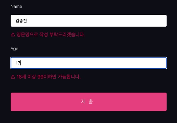 기능을 더하면 유효성에 어긋났을 때 조건부 렌더링을 통해 무엇이 어떻게 잘못 작성되었는지 각각 맞게 내용을 전달할 수 있다!