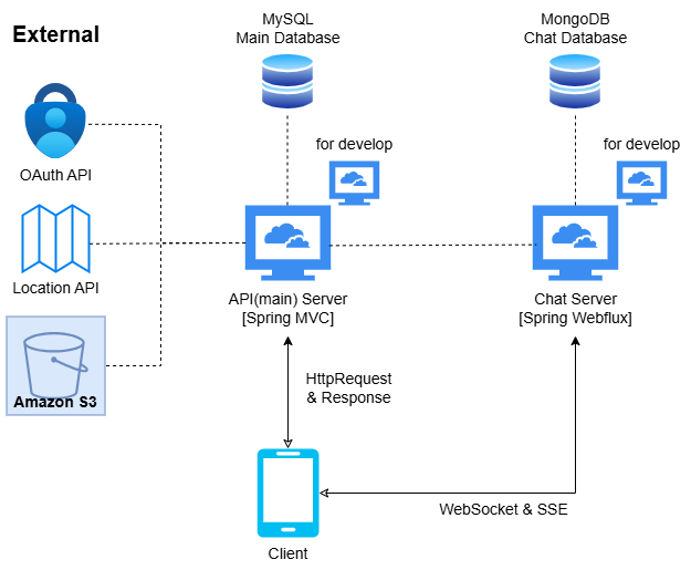 또한 트래픽이 몰릴 서버이기 때문에 처리가 늦어지면 곤란하여, 채팅에 들어가는 image 파일들도, API Server 를 통해 Amazon S3에 업로드하여 링크를 받아온 후, 해당 링크를 MongoDB 에 저장하는 방식으로 운용할 예정이다.