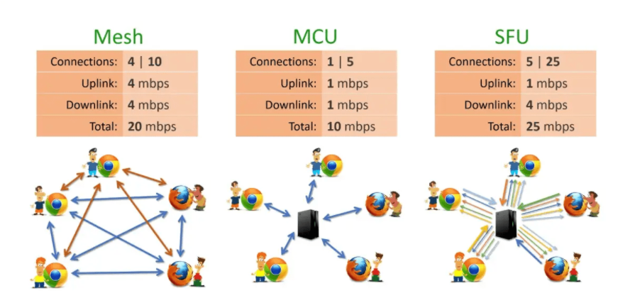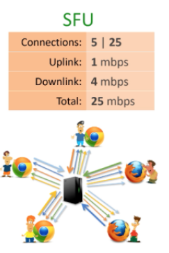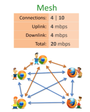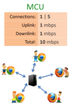 upstream과 1개의 downstream을 가지는 구조 → 클라이언트의 부담이 적다.Peer의 스트림을 모아 인코딩 & 디코딩 모두를 하기 때문에 서버 성능이 받쳐줘야 한다. 또한 실시간 송수신 보장이 어려울 수 있다.Peer의 부하가 가장 적음 → 당연히 서버의 부하는 그만큼 커진다.