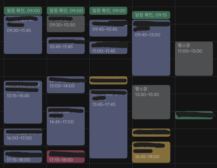 이건 제 예시입니다. 구글 캘린더를 쓰는 것을 추천드립니다. 휴대폰, 노트북과 연동하기도 편하거든요.