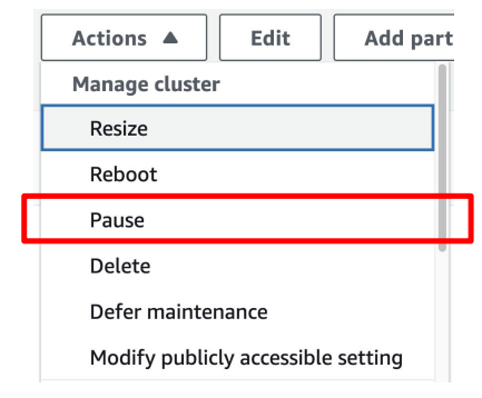 - Redshift 콘솔에서 해당 Redshift 클러스터를 선택하고 상단 메뉴에서 Stop 선택