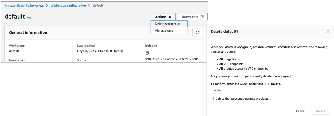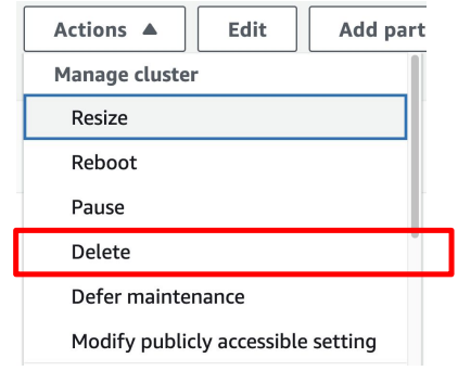 - Redshift 콘솔에서 삭제할 클러스터를 선택하고 상단 메뉴에서 Delete 선택