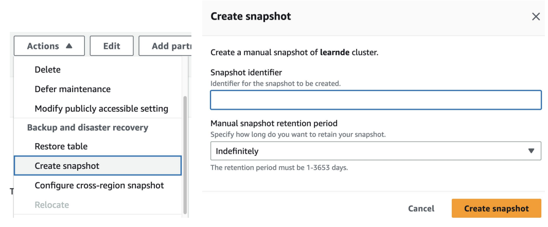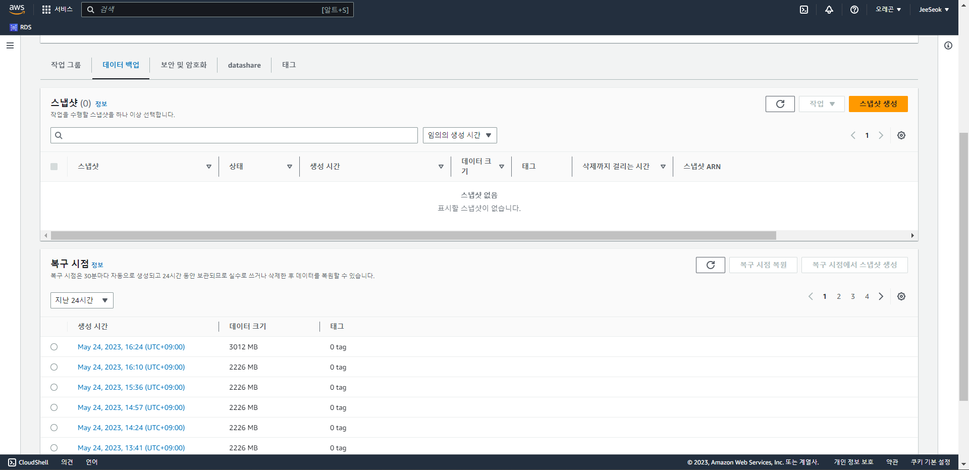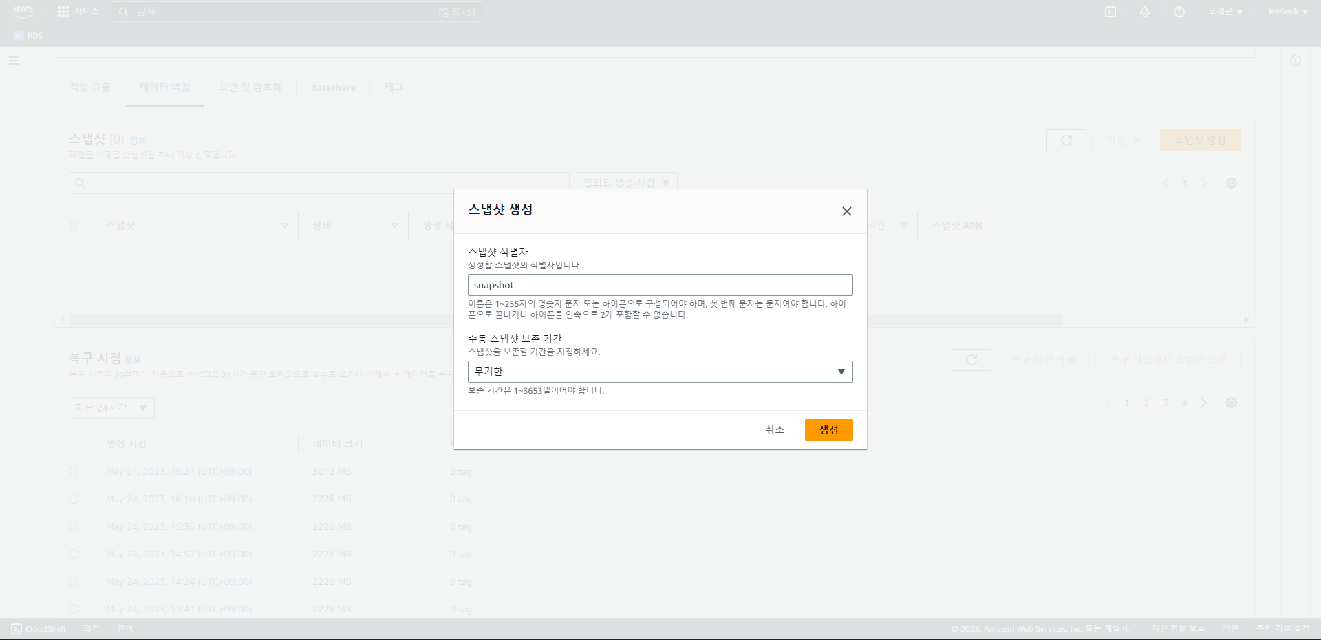 - 스냅샷 생성을 통해 매뉴얼 스냅샷을 생성할 수 있으며 보존 기간 또한 설정 가능하다.