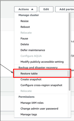 1. 해당 Redshift 클러스터에서 “Restore table” 메뉴 선택