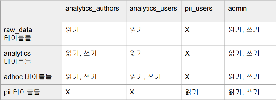 - 역할 (Role) 혹은 그룹(Group) 별로 스키마별 접근 권한을 주는 것이 일반적
