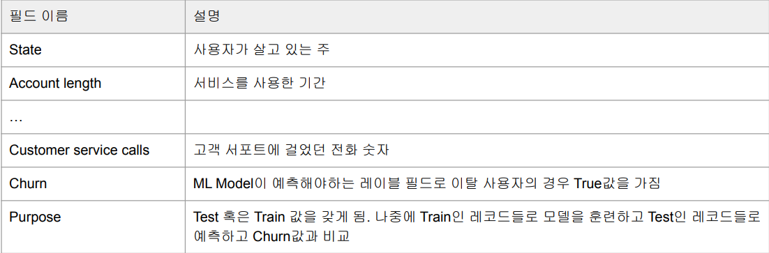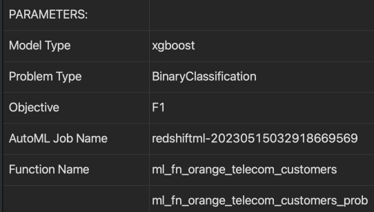 - raw_data.orange_telecom_customers에서 purpose 컬럼의 값이 Train을 대상으로 SageMaker를 이용해서 ML 모델을 생성하고 이를 호출할 수 있는 SQL 함수도 지정