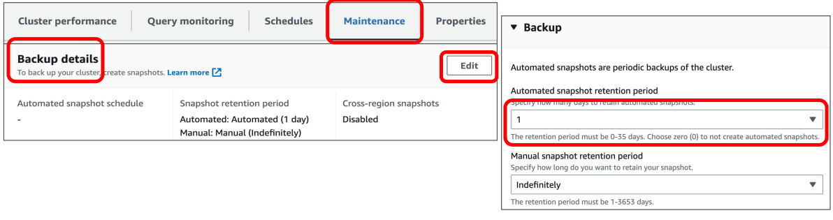 - 관련 Redshift 클러스터의 Maintenance 탭 -> Backup details -> Edit