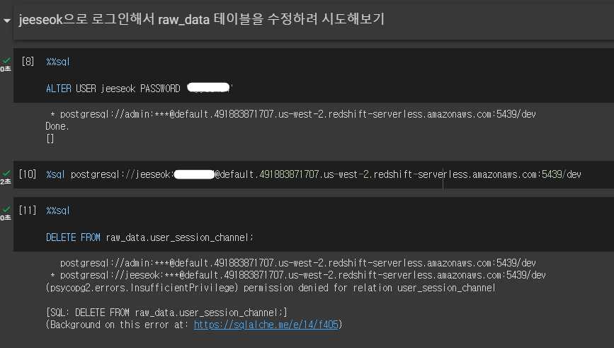 - jeeseok 계정으로 들어가서 DELETE를 하려고 하면 권한이 없어서 에러를 확인할 수 있다.