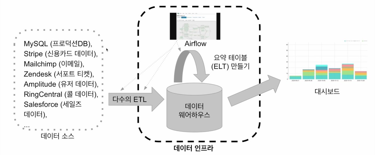 - 외부(회사 밖)와 내부 데이터 소스에서 데이터를 읽어다가 (많은 경우 API를 통하게 됨)