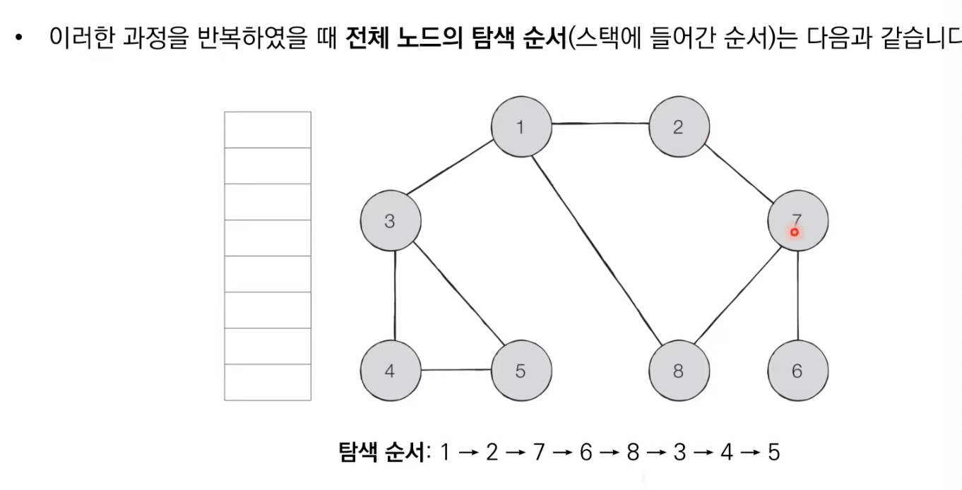 2.스택의 최상단 노드에 방문하지 않은 인접한 노드가 하나라도 있으면 그 노드를 스택에넣고 처리한다.(방문하지 않은 인접 노드가 없으면 스택에서 최상단 노드를 꺼낸다)