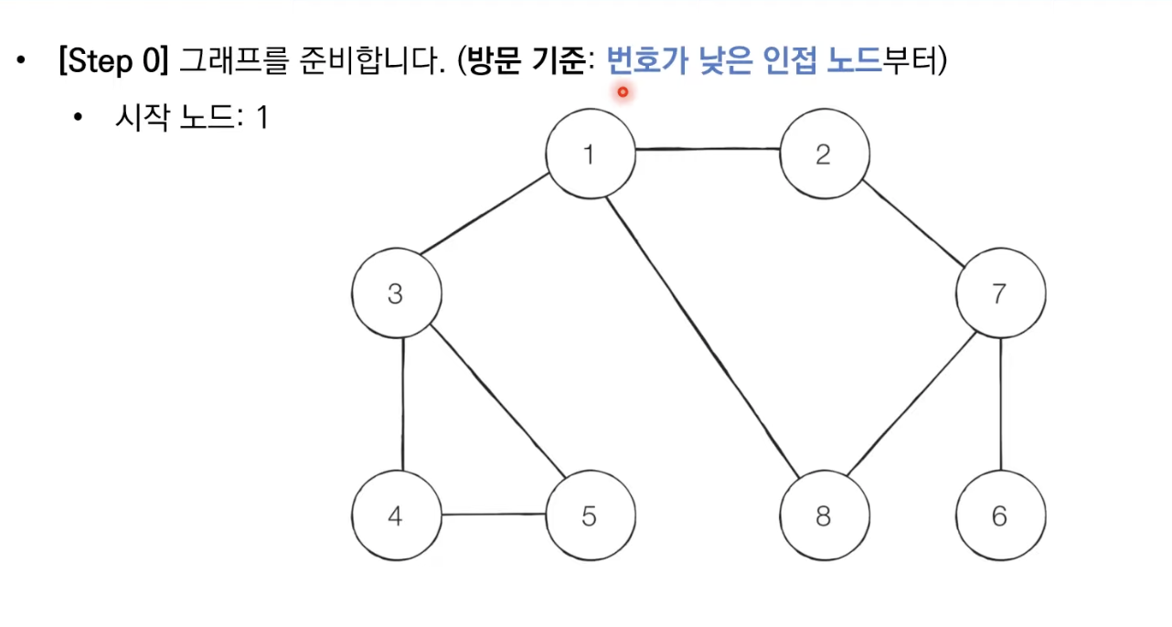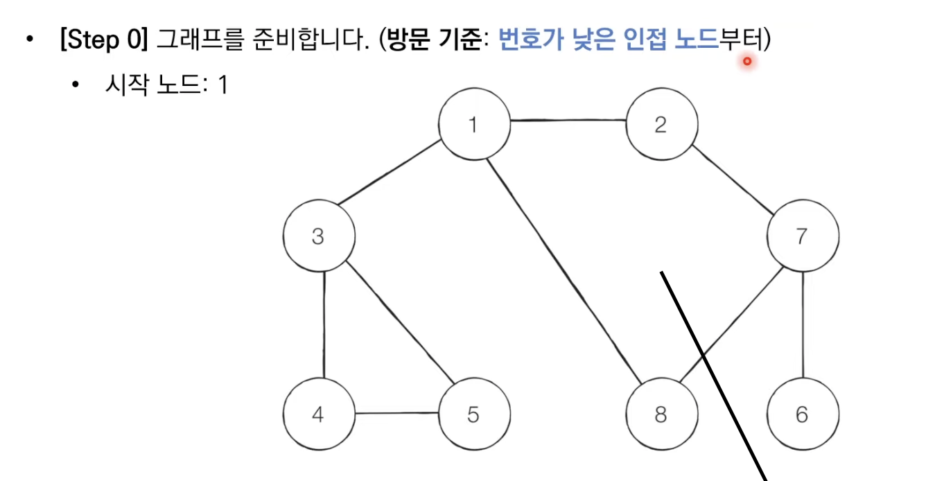 1.탐색 시작 노드를 큐에 삽입하고 방문 처리.