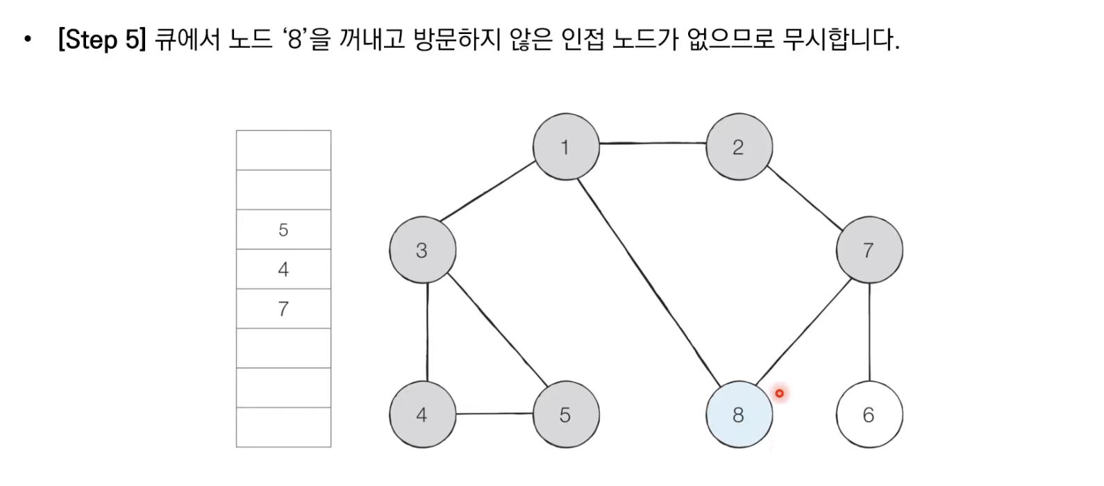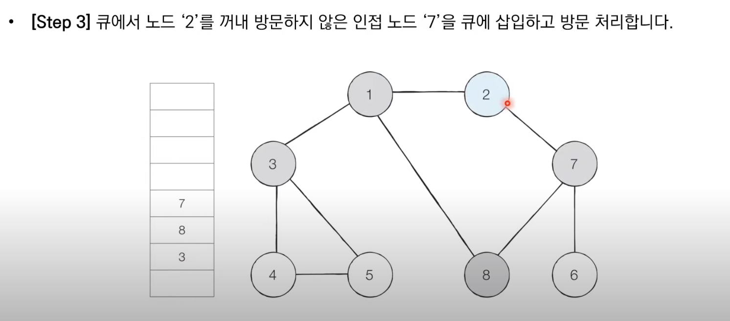 2.큐에서 노드를 꺼낸뒤에 해당 노드의 인접 노드 중에서 방문하지 않은 노드를 모두 큐에 삽입하고 방문처리