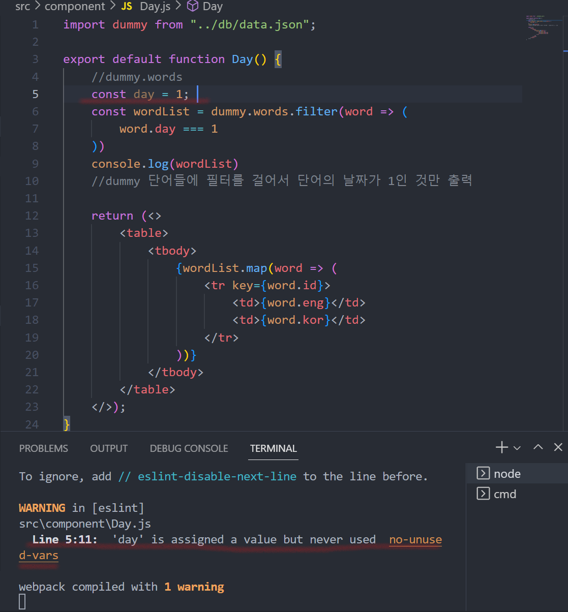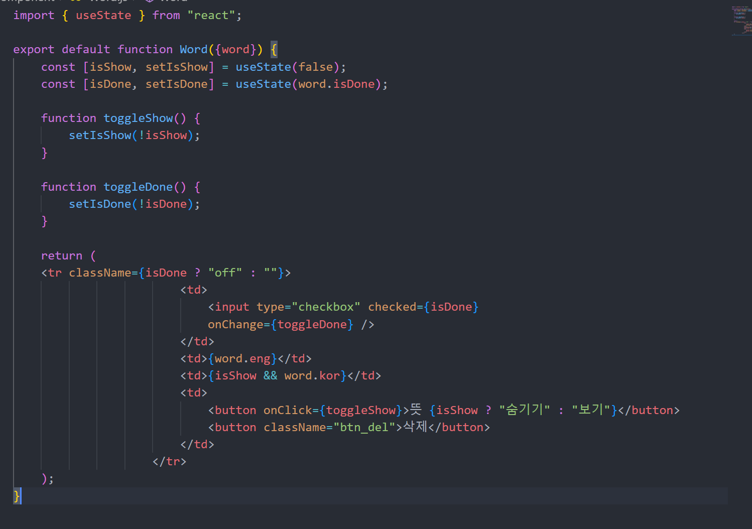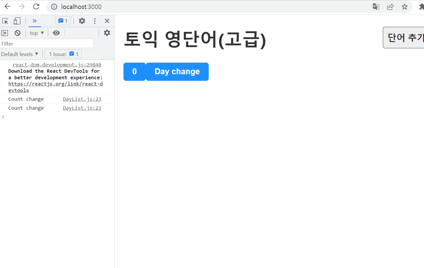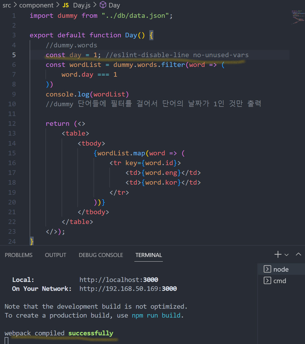 ++ Day.js에 있던 table을 Word라는 별도의 컴포넌트를 만들어서 그쪽으로 옮겨주고 Day에는 Word를 불러오기만 해준다.
