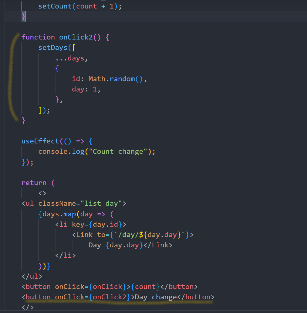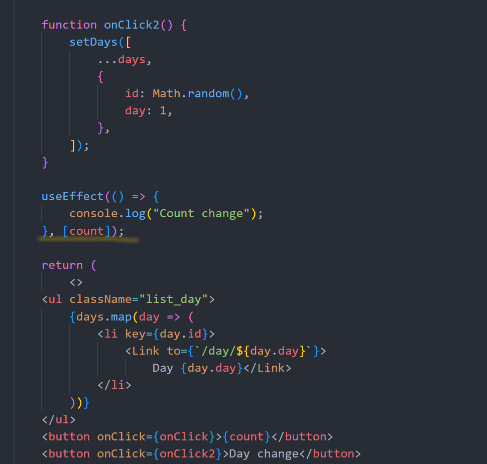 :<Route path="/day/:day">의 :(콜론)은 변화하는 url을 처리할 때 이용함.