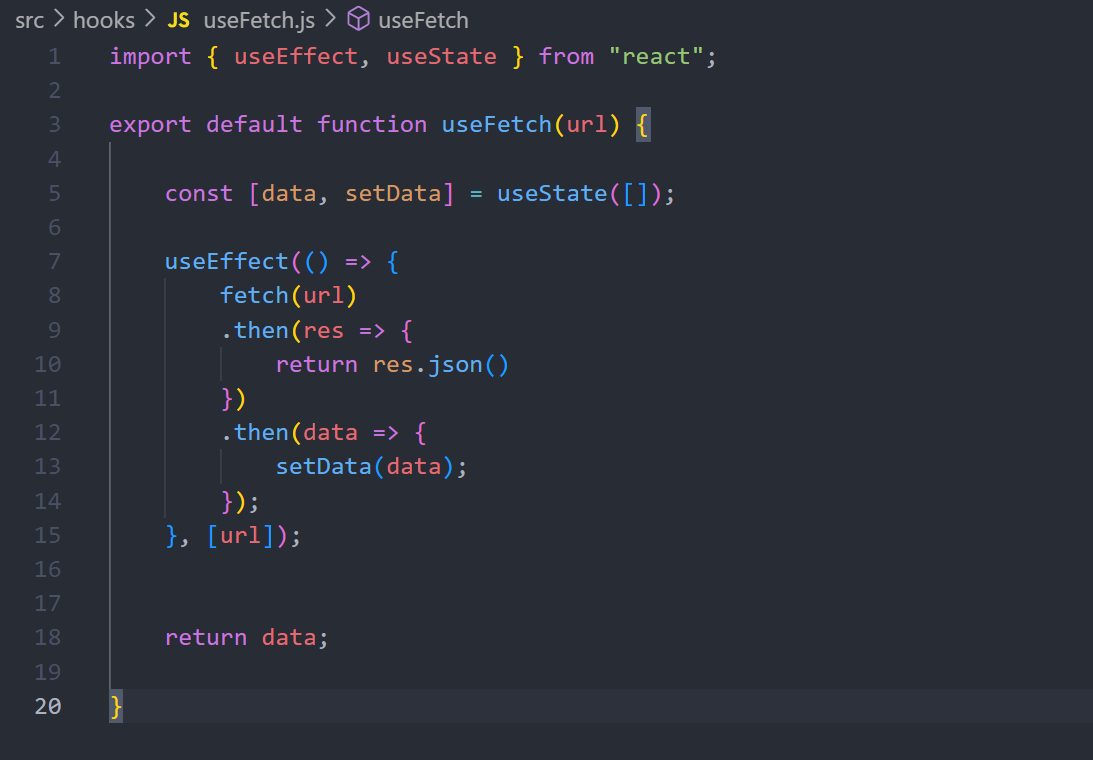data라는 상태값이 있고 API주소(url) 넘겨받아서 설치하고 응답하는 데이터를 셋팅해준 후 리턴해준다.