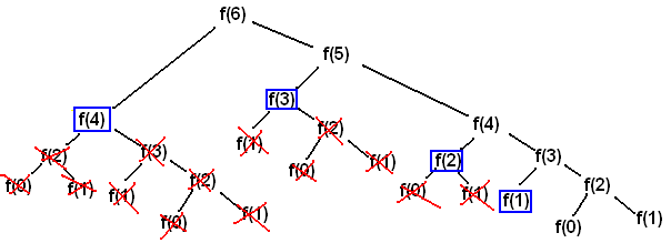 동적 계획법을 사용하지 않은 피보나치 수열 함수이다. 위 그림에서 호출된 함수를 보면, 4번째 피보나치 수열 항을 구하기 위해서 fib(0)이 2번 리턴되고, fib(1)이 3번 리턴되고, fib(2)이 2번 리턴되고… 하는 식으로 중복되어 계산하는데, 이는 연산에서 비효율적인 출입이 있다고 볼 수 있다.