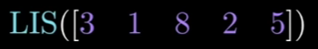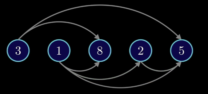 [3, 1, 8, 2, 5]의 리스트에서 가장 긴 오름차순 부분 수열은 [1, 2, 5]이며 길이는 3이다. 위 리스트의 요소들을 위상정렬에서 배운 DAG로 다시 표현하면 아래 그림과 같다.