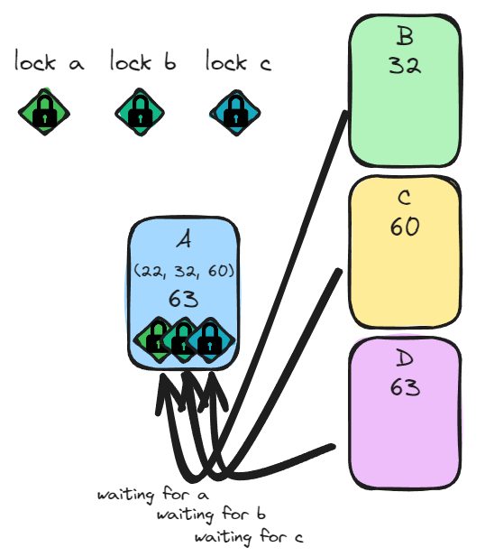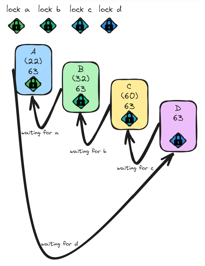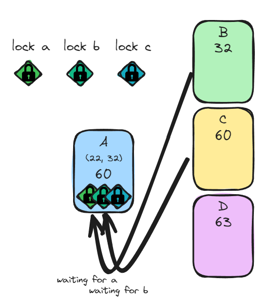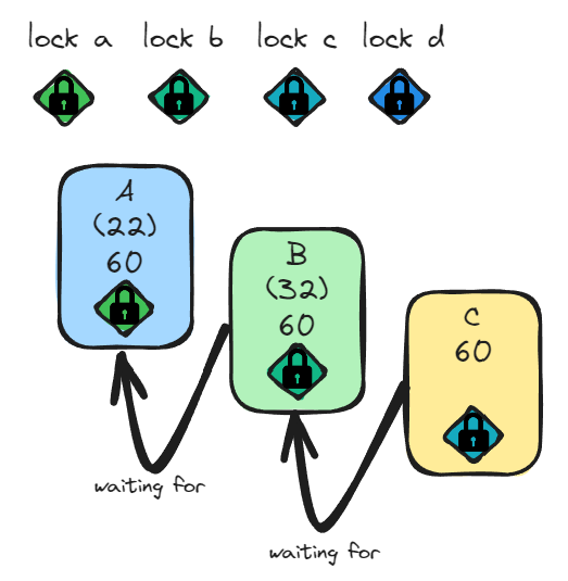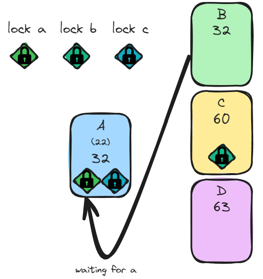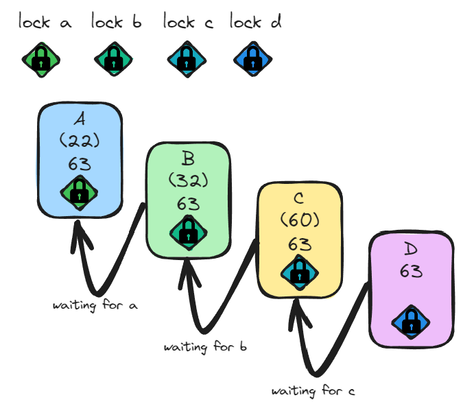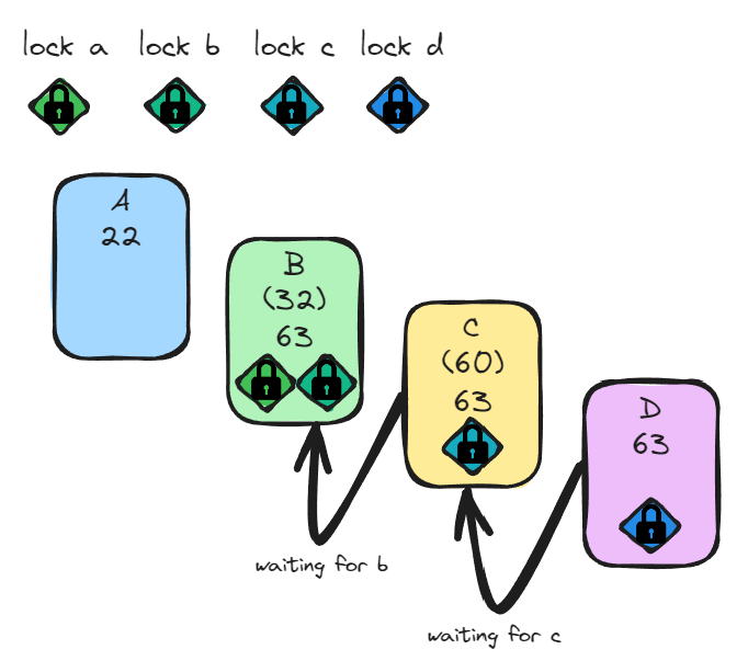A는 lock a로부터 B에게 32의 우선순위를 기부받고 있고, lock b로부터 C에게 60의 우선순위를 기부받고 있고, lock c로부터 D에게 63의 우선순위를 기부받고 있다. 이 때 중요한 점은 A의 우선순위를 60에서 63으로 교체해주는 것 뿐만 아니라, lock b를 계속 가진 채로 다시 lock c를 해제할 경우를 대비해 60에 대한 우선순위 정보를 저장해야만 한다는 것이다. lock a, b, c가 모두 A로부터 해제된 다음에야 A는 원래 자신의 우선순위인 22로 돌아올 것이다.