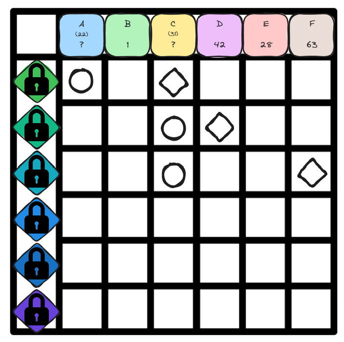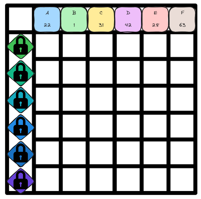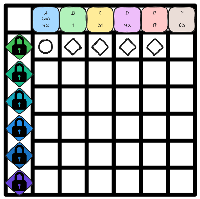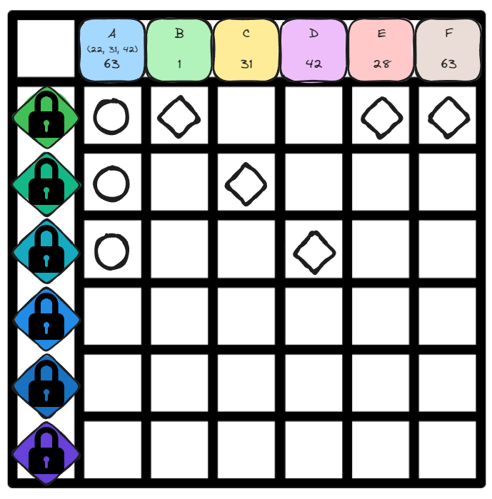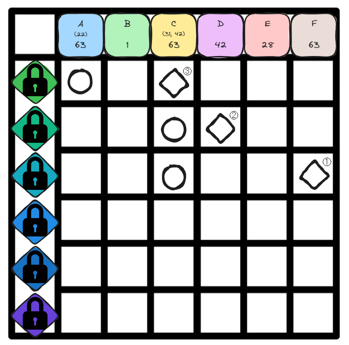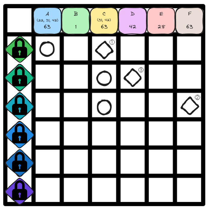 스레드 A, B, C, D, E, F와 lock a, b, c, d, e, f가 있고 이 사이 관계와 그에 따른 우선순위에 대해 표로 나타낼 것이다. 여기서 스레드가 어떤 락을 가진 상태를 ○로, 락에 대기하고 있는 상태를 ◇로, 락을 해제한 상태를 빈 칸으로 둘 것이다.