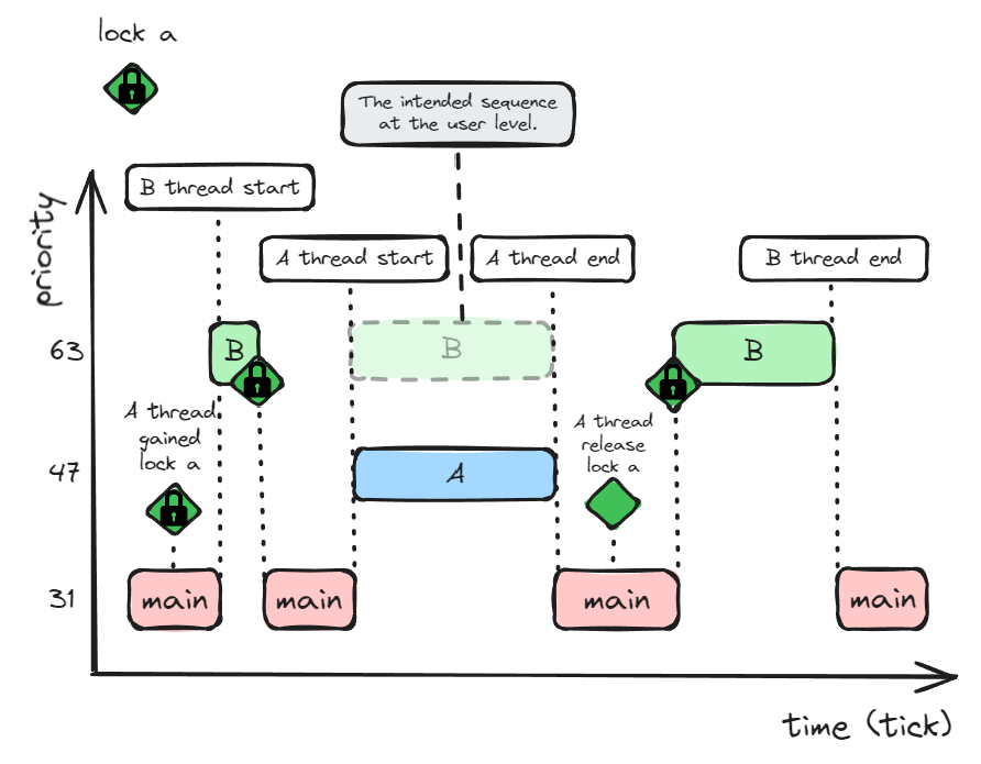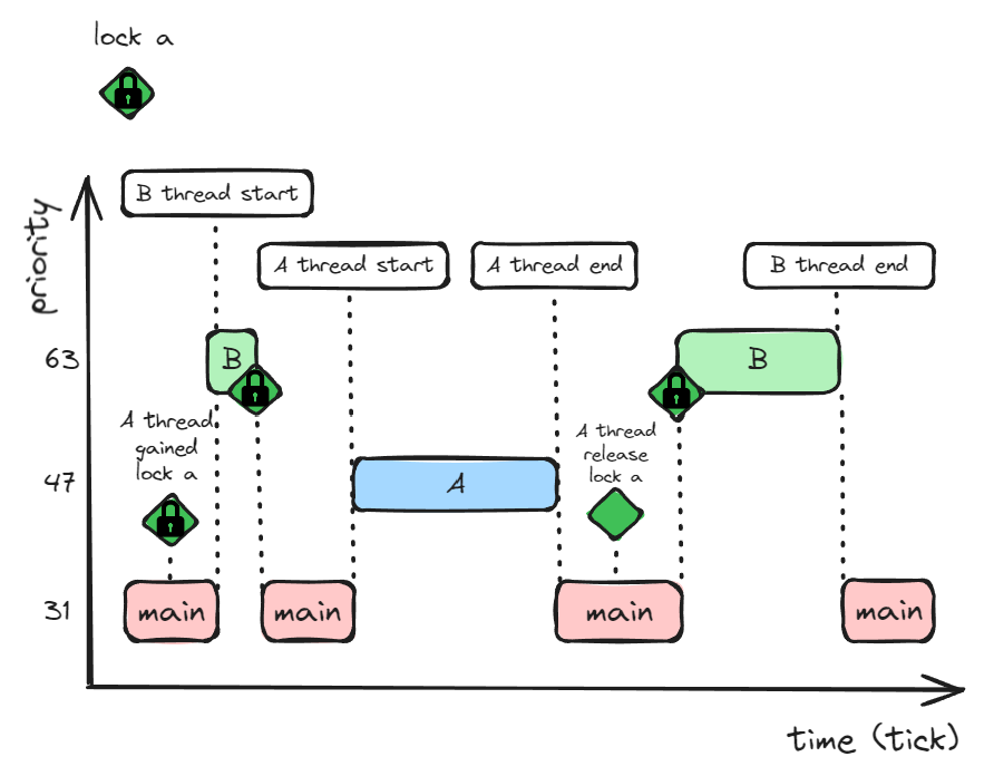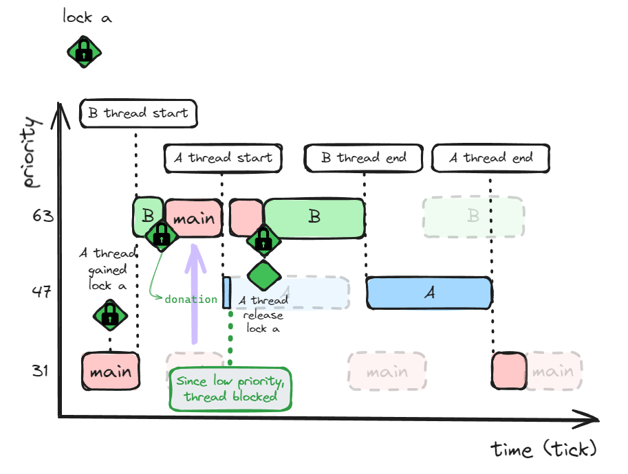 Donation 기능을 구현한다면 스레드 main은 스레드 B가 lock a에 접근하는 순간 스레드 B로부터 우선순위 Donation을 받게 되고, 스레드 A가 만들어지는 순간 A에게 스케줄 점유를 빼앗기지 않게 된다. 따라서 코드의 로직이 유저의 의도대로 아래와 같이 흘러갈 수 있다.