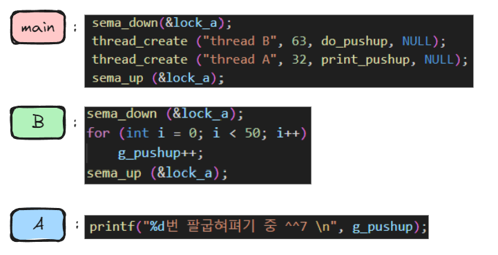 thread_create ("thread B") 단계에서 B의 우선순위가 더 크기 때문에 스케줄러는 B로 콘텍스트 스위칭을 해준다.sema_down(&lock_a)를 만나면 스케줄러는 B를 BLOCK 상태로 만들고 ready list에 실렸던 main으로 다시 콘텍스트 스위칭을 해준다.thread_create ("thread A") 단계에서 A의 우선순위가 더 크기 때문에 스케줄러는 A로 콘텍스트 스위칭을 해준다.0번 팔굽혀펴기 중 ^^7