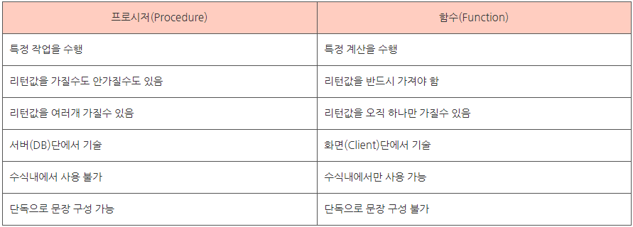 위는 프로시저(Procedures)와 함수(Function) 사이의 차이를 정리한 표이다.
