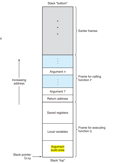 또한 Q 프로시저에 대한 return address는 P 스택 프레임에 쌓인다는 것이다. 왜냐하면 Q 프로시저에서의 작업이 끝나고 프로그램 카운터가 ret을 만나면, 원래 호출했던 P에서 기억했던 위치로 되돌아가야 하기 때문이다.