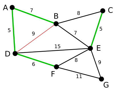AD 와 CE 가 가장 짧은(가중치가 가장 작은) 변이다. 아무거나 골라서 AD를 선택한다. AD의 색을 변경하였다.