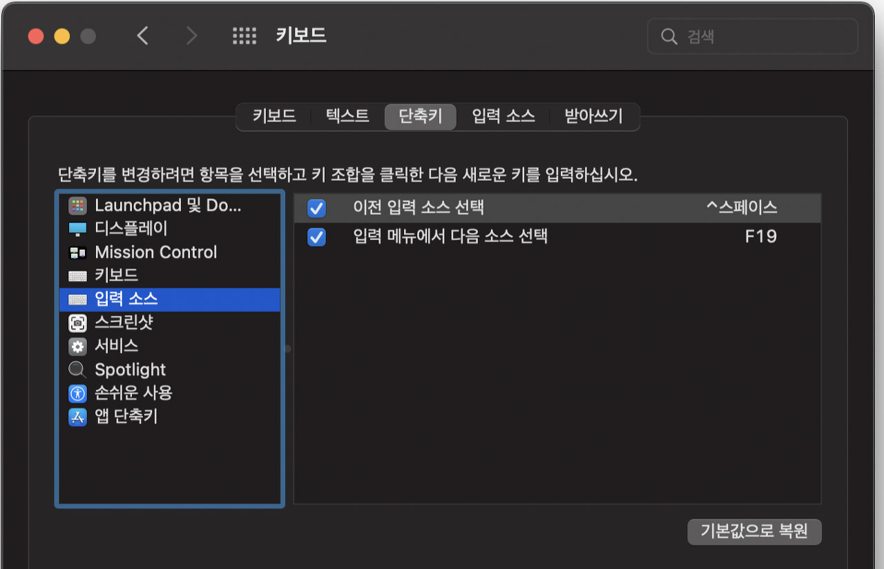 입력 메뉴에서 다음 소스 선택 부분을 선택하고, Caps Lock 키로 눌러주면 위 사진들처럼 F19로 바뀌는 것을 볼 수 있다.