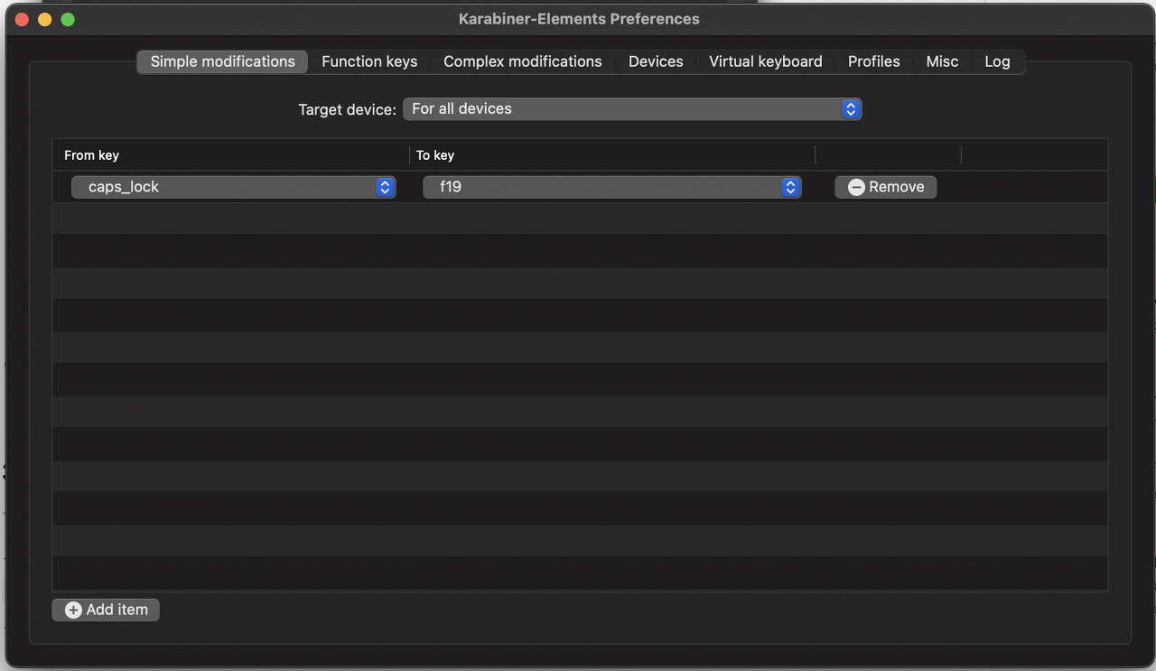 무언가가 하나 추가될텐데, From key에 Modifier Keys -> caps_lock, To key에 Function Keys -> f19 를 설정해주기만 하면 된다.