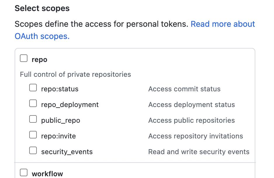 권한이 정해지지 않은 토큰은 공개적인 정보에만 접근할 수 있다. 만약, command line으로 레포지토리에 접근한다면, 권한을repo로 설정하면 된다. (추가적으로 설정 가능한 scope를 문서에서 확인할 수 있다.)