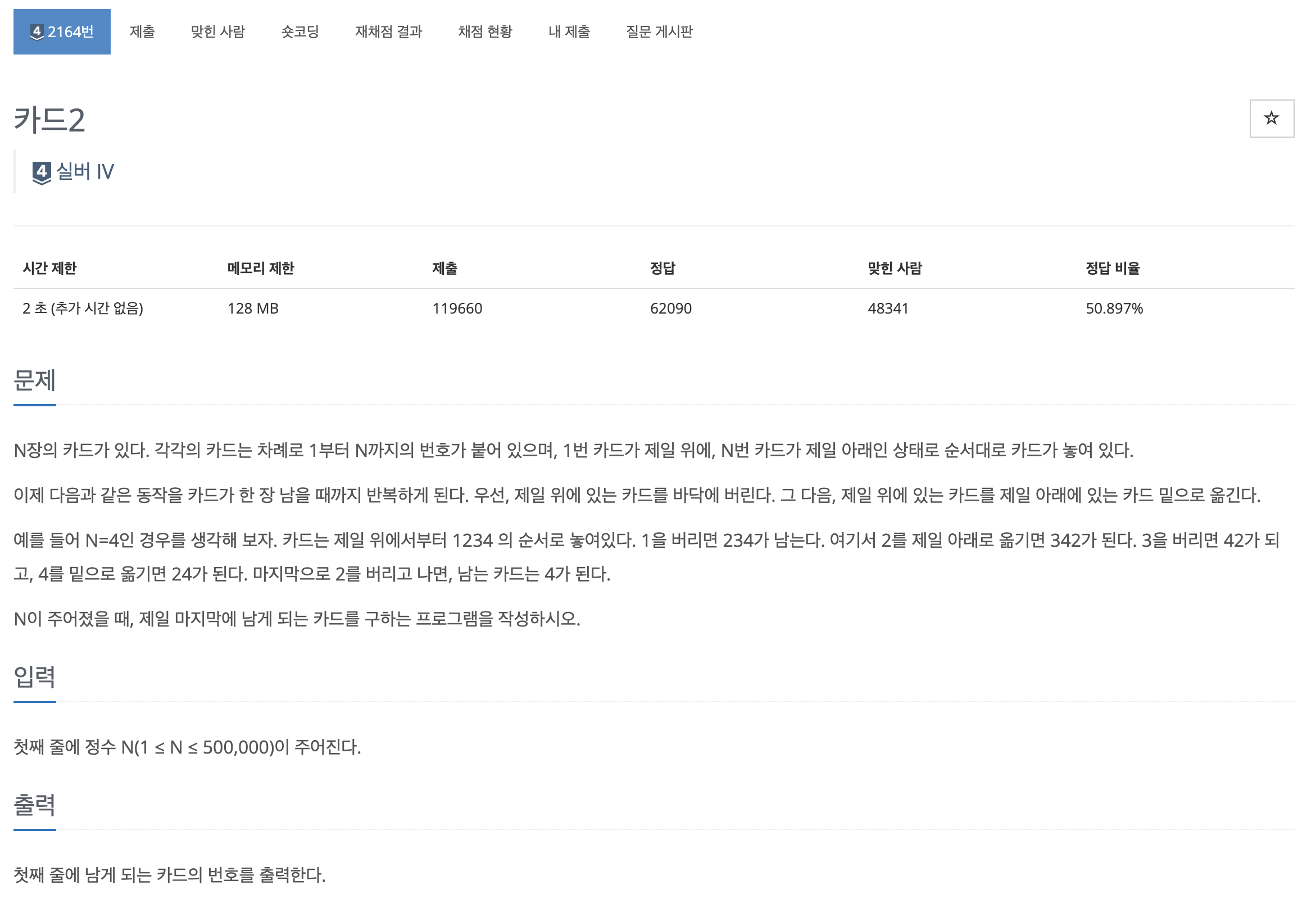 백준 2164번 카드2 문제 풀어보기