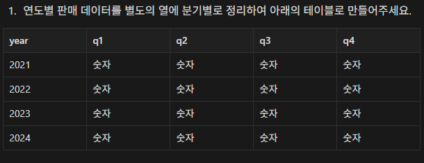 # 연도별 판매 데이터를 별도의 열에 분기별로 정리하여 아래의 테이블로 만들어주세요.
