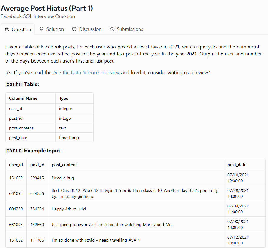 URL : https://datalemur.com/questions/sql-average-post-hiatus-1