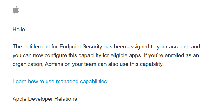 며칠 기다리다 보면 애플에게 Endpoint Security에 대한 응답을 받을 수 있다!